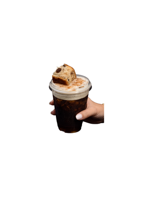 ICED COLD BREW TOPPED W/VANILLA COLD FOAM, CINNAMON SUGAR DUSTING & HOT CROSS BUN ON TOP